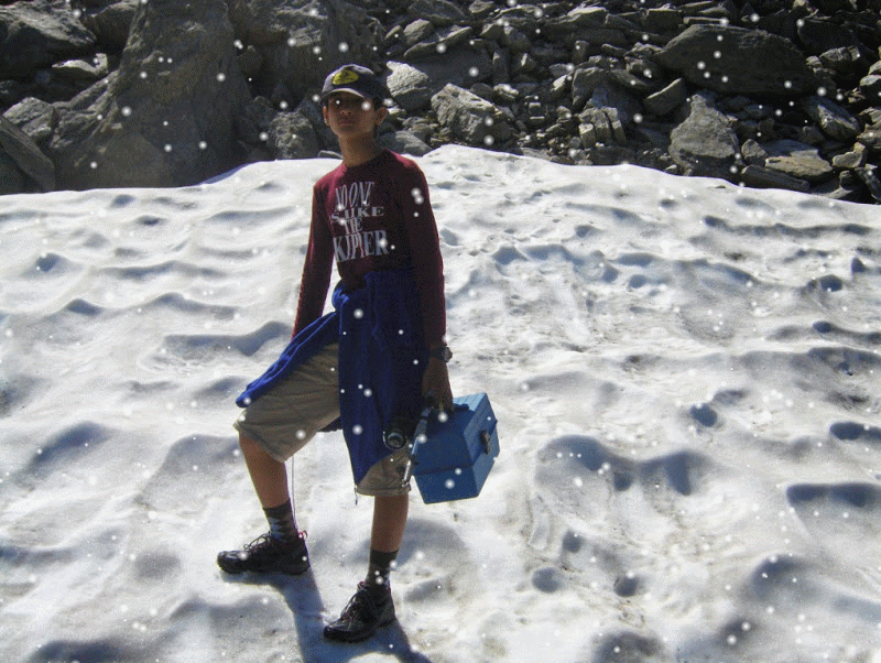 Di musim panas bulan Agustus, pada ketinggian diatas 2000 m, bongkahan salju masih mampu bertahta, sekalipun sebagian daerah kekuasaan sudah menghijau dijarah oleh matahari. Berpose dengan celana pendek dan beralaskan dataran salju, membuat klik foto berpijar, flash flish flosh...